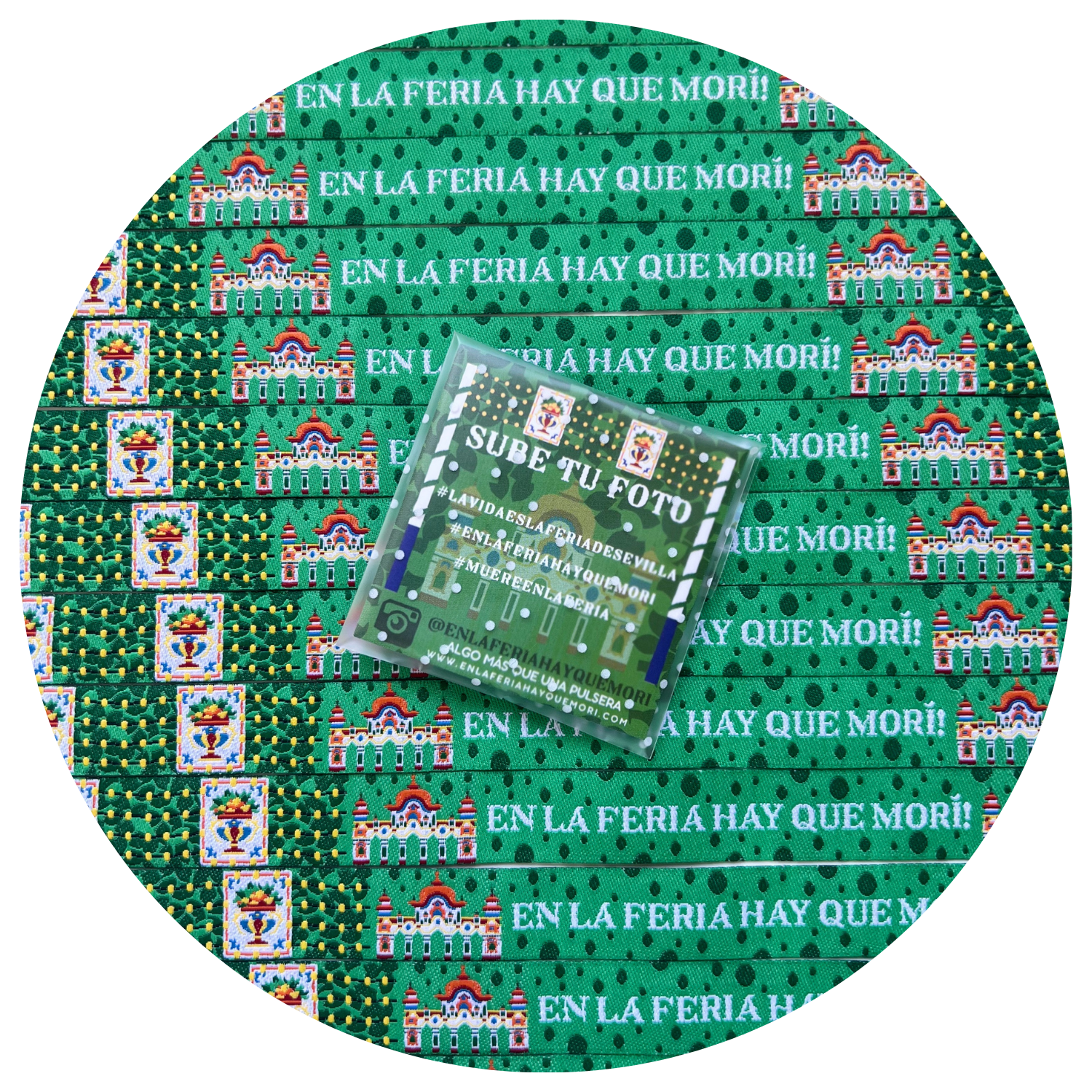 La pulsera de este año está inspirada en la vida y la luz de la Feria. Presenta un verde Andalucía característico de nuestra bandera, combinado con lunares en un tono más oscuro que hemos denominado “verde hoja”.